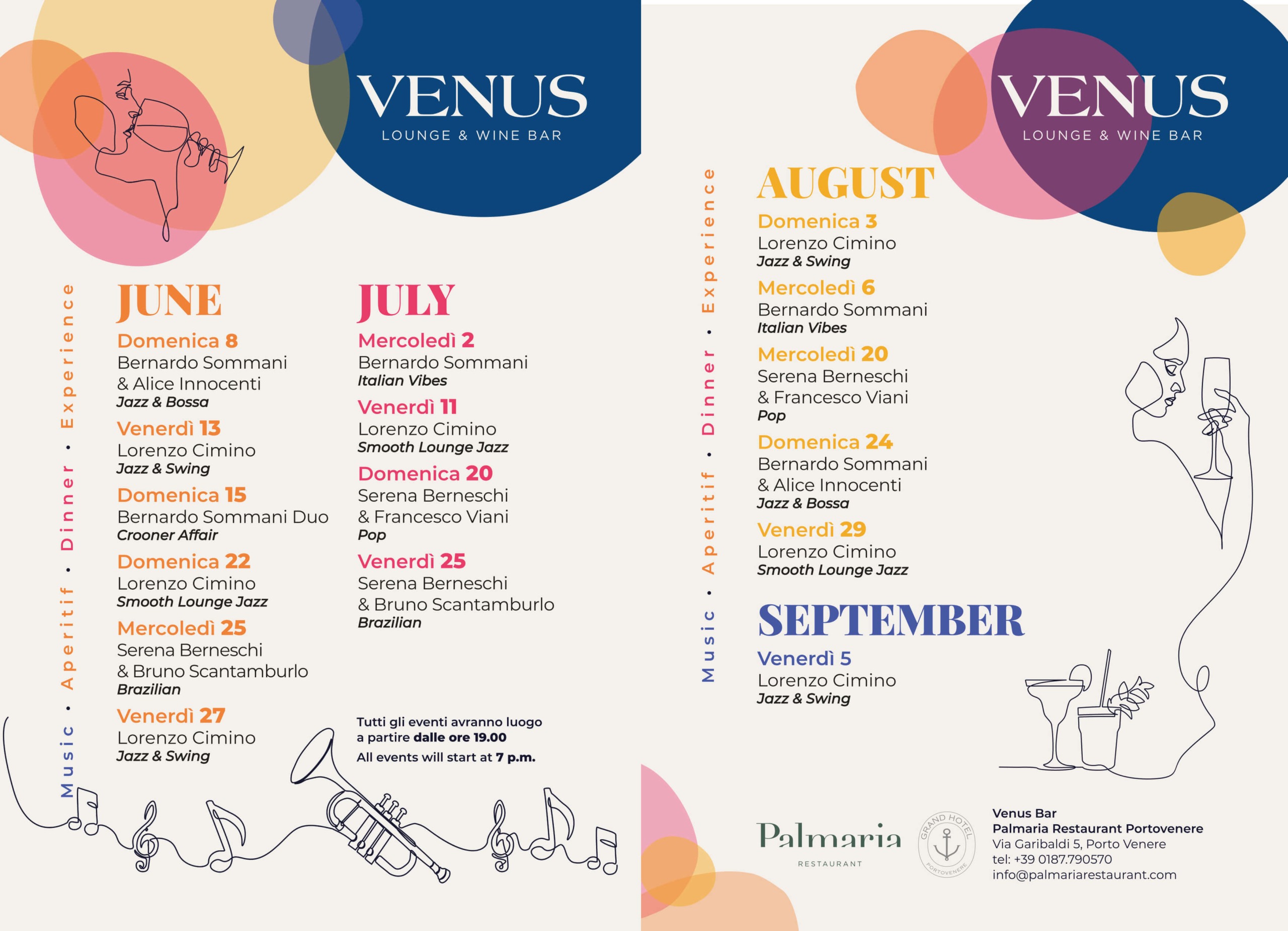 Palmaria Restaurant and Venus Bar have a fantastic calendar of live music concerts, themed aperitifs, and dinner tastings.